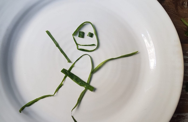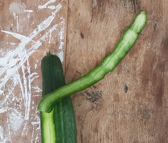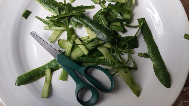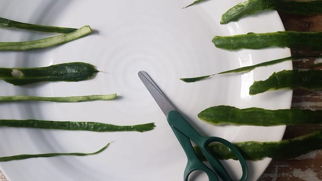 S’amuser avec des peaux de concombre, ça détend ! Suffit d’abord de peler finement le légume puis de le découper en bandes bien régulières / et z’ensuite…