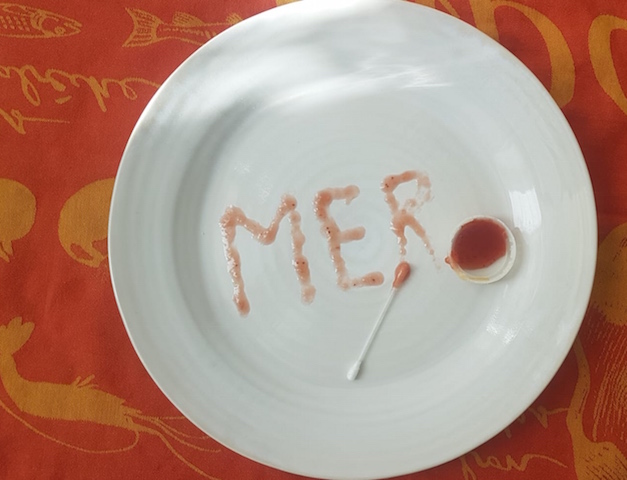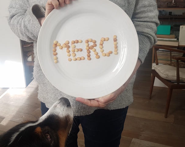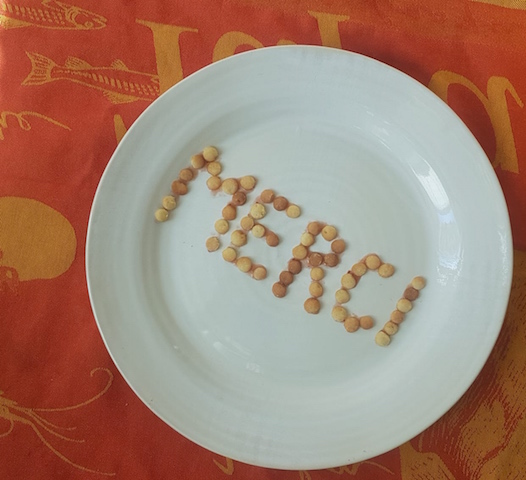 Mais ce n’est pas tout! Pendant la cuisson à vous d’écrire avec de la confiture sur une grande assiette les lettres du mot MERCI (bien commencer au bord de l’assiette pour pouvoir caser toutes les lettres).