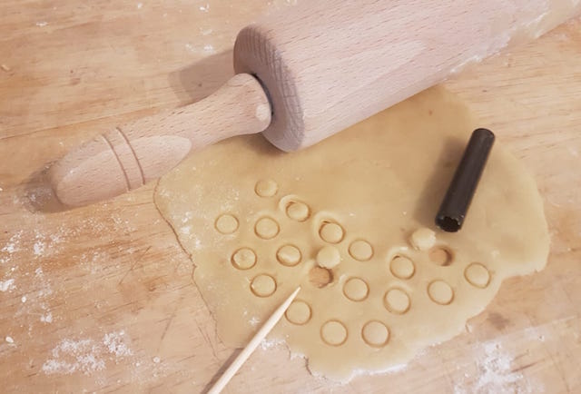 - Étaler la pâte sur un plan de travail fariné pour obtenir une couche bien fine. Puis “emportepiécer“ (un terme de grand cuisinier !) avec un capuchon de feutre (si le mini gâteau reste coincé dans le capuchon on le retire avec une pique en bois)