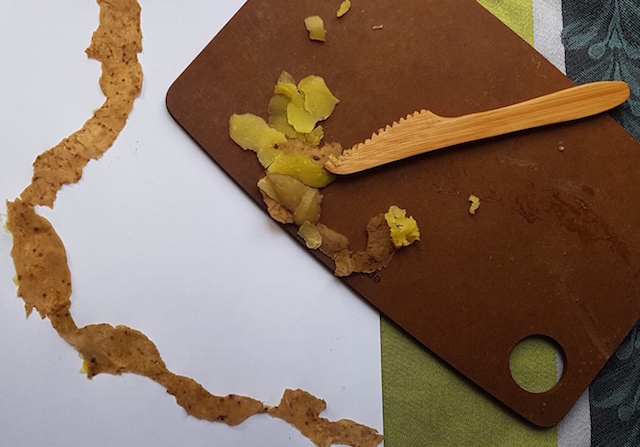 Poser la pelure sur une feuille en faisant remarquer à son gus que l’amidon resté sur la pomme de terre est une bien fameuse colle.