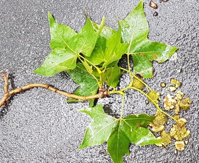 Tiens, voilà qu’un grand coup de vent et un reste de pluie nocturne me font trébucher ce matin sur une branche de platane tombée au sol… que je ramasse.