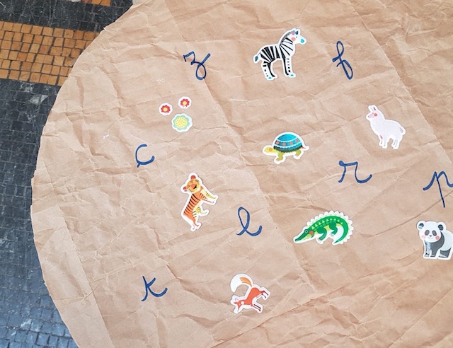 On colle d’abord les gommettes sur une feuille de papier. Un parent écrit la première lettre du nom de chaque animal-gommette, de façon aléatoire sur la feuille.