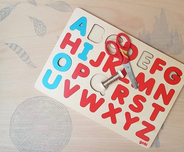« Mais ça va matcher d’enfer avec mon encastrement de lettres en bois, inspiration Montessori ! » ke je me suis dit. J’ai commencé par un petit bricolage en faisant des anneaux de fil de fer à attacher à chaque lettre. Elles remplaceront, pour un temps, les poissons de la pêche à la ligne.