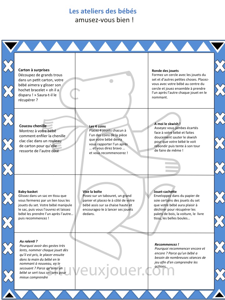 Z’ensuite on passe un sacré bon moment avec son bébé en lui proposant l’un ou l’autre des 8 jeux de la fiche « Atelier des bébés » que je vous ai concocté, et que j’ai testé avec des mini de mini z’enfants. Et que vous pouvez imprimer.