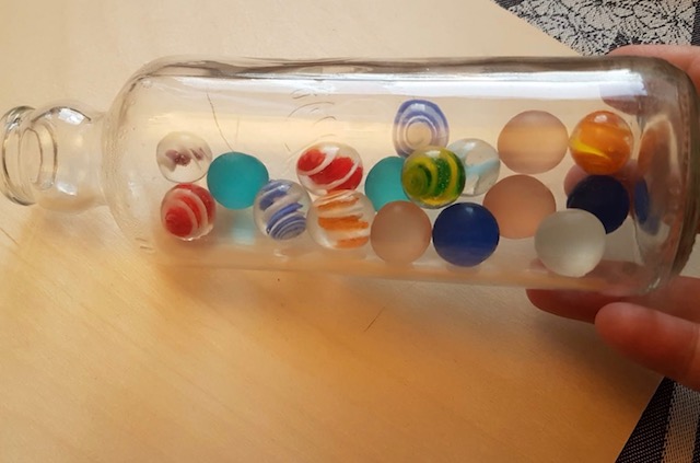 Bouteille aux billes : Chaque joueur prépare sa bouteille en y mélangeant 5 billes de deux sortes (ou des grains de maïs et des haricots). Chacun doit tenter de faire sortir uniquement une sorte de billes (ou de grains) sans qu’aucune autre ne s’échappe de la bouteille. Celui qui réussit marque 1 point et on recommence 5 fois le jeu avant de compter les points et de désigner le gagnant.