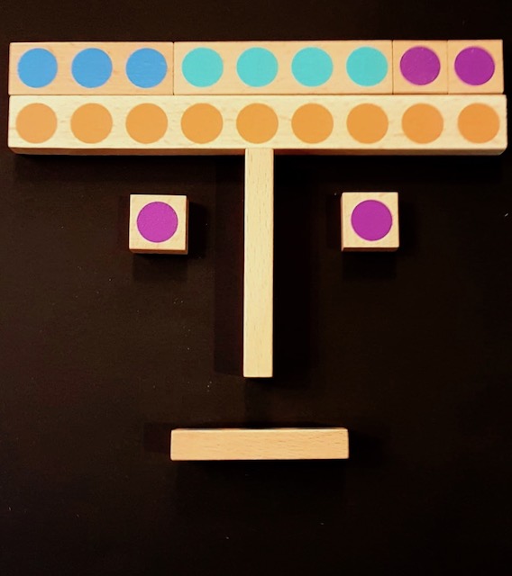Je joue aussi au “Mémo des ronds“ en demandant à l’enfant de bien m’écouter : « 1 réglette avec 3 ronds, une autre avec 4 ronds, une avec 1 rond » (hi, hi, bien de ne pas les mettre en ordre !) Je laisse un temps d’arrêt pour qu’il mémorise la consigne. Puis je lui demande de faire un train de réglettes en les nommant, avant de chercher une réglette de même longueur qu’il accole à l’autre. Et hop moi j’en fais un bonhomme (ho, ho, un peu de rigolette fait toujours du bien)