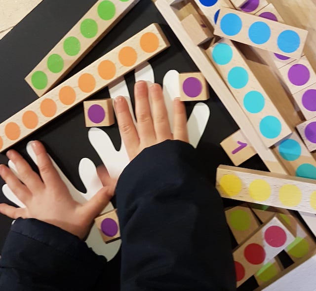 Je prends une réglette avec 1 rond dans une main et 2 réglettes avec 1 rond dans l’autre. Je les cache dans mon dos pour faire deviner (et compter) dans quelle main se cachent les 2 réglettes. Quand il a trouvé, je demande au gus de les associer avec une réglette à 2 points, puis on fait tout pareil avec la réglette de 3, 4, 5…. (un peu chaque jour, bien sûr !)