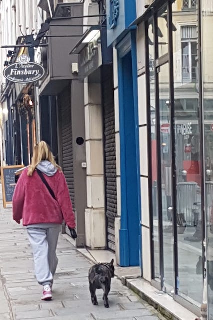 Oh, comme j’aime vous parler de ces rencontres- surprises, celles qui me donnent la pêche quand je vais z’o’boulo…. Là, je repère dans la rue un truc qui m’amuse : une La-madame-avec-chien…