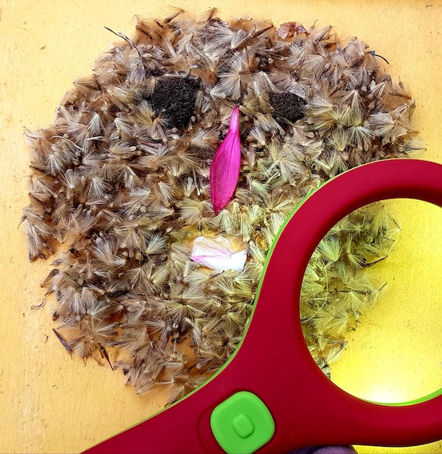 Puis on passe à la séance d’observation avec ce que j’ai glané durant mon trajet maison/ travail : du « mimi » de platane et des « déchets » en train d’être balayés par la fleuriste du coin.