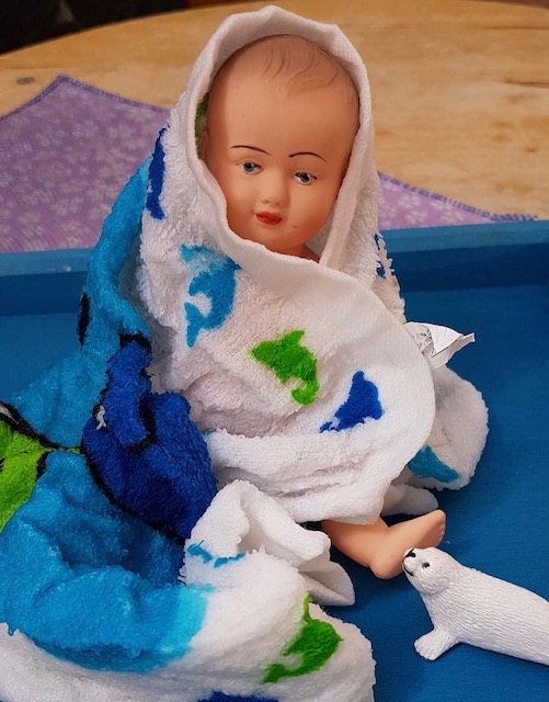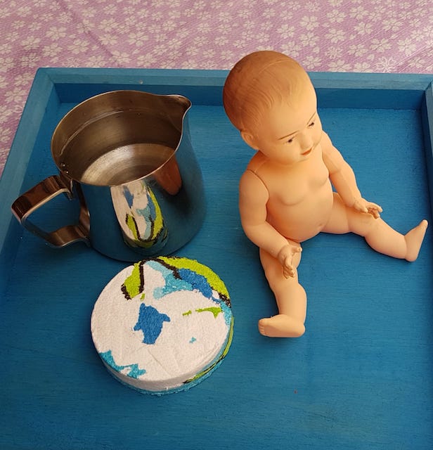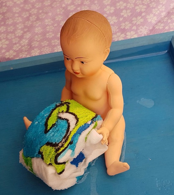 Et c’est parti pour la séance de jeu d’eau en version minimaliste : Verser l’eau du broc dans le plateau – Regarder la serviette « se gaver » d’eau- Laver son baigneur – Essorer la serviette bien fort au dessus du broc pour le remplir à nouveau, puis recommencer encore et encore en suivant le même déroulé …