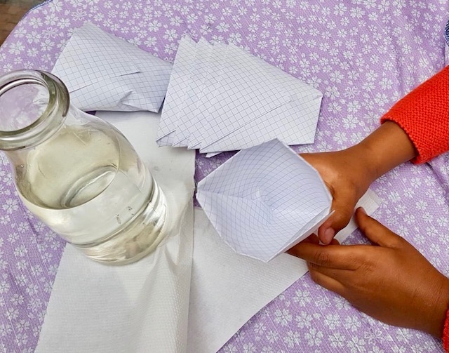 À vous maintenant de récupérer les feuilles des vieux cahiers de vos titis, (pas du papier trop fin, ni celui des magazines : avec eux ça coule) pour vous lancer dans l’art de fabriquer des gobelets… d’exception!