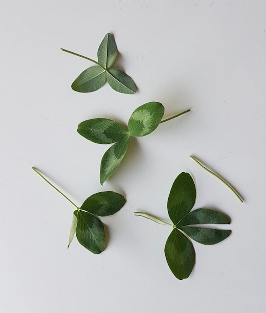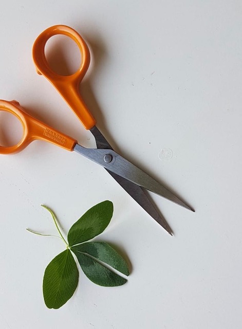 Et on fait comme ça : Fendre avec des ciseaux pointus la feuille opposée à la tige du trèfle, puis séparer la tige en 2.