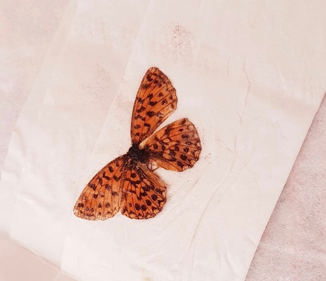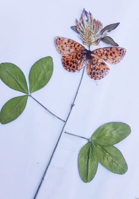 Voilà mon œil attiré par un papillon « mouru ». Il s’est éteint dans le champ de trèfles dont il a tant aimé suçoter le nectar. Ah non, pas question de le laisser s’abîmer ici. Et hop je l’emporte. Et zou je le fais sécher (presse-fleurs du Si Tu Veux recommandé ! )