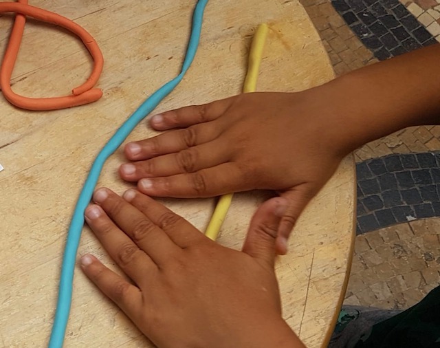 Les petites mains d’un gus passant par le Si Tu Veux roulent la douce pâte à modeler pour former de fins rouleaux, les fameux colombins !