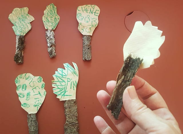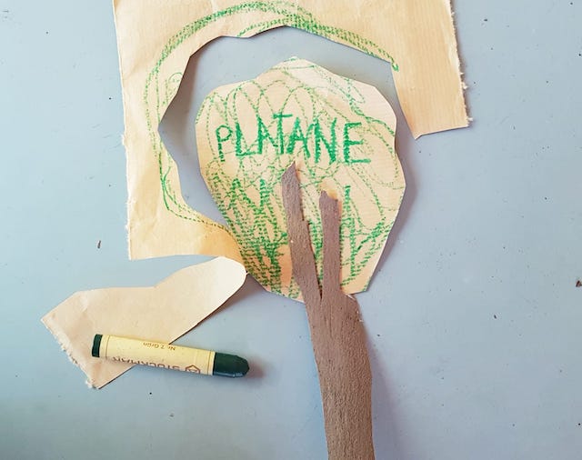 Vient ensuite, une fois rentrés à la maison, l’activité consistant à fabriquer des arbres. Dessiner branches et feuilles- inscrire l’espèce – découper – assembler tronc et feuillage avec de la colle.