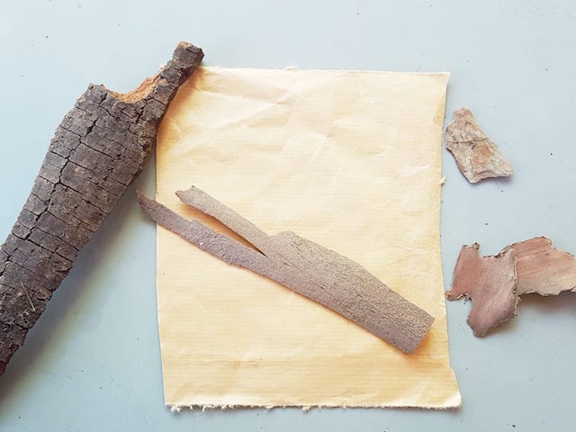 S’agit d’abord de lever le bout de son nez en balade pour repérer des sortes d’arbres différentes et les nommer. Puis proposer au gus ou à la gussette qui nous accompagne de ramasser des bouts d’écorce. Il y en a toujours au pied des arbres, au sol ou sur des branchettes de bois mort (interdit de les choper sur un arbre vivant, aïe, aïe, aïe, ça le blesserait !!!!!)