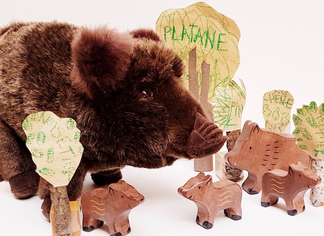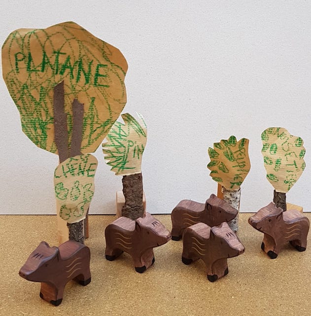 Pour les faire tenir droit, on scotche le tronc à un cube en bois afin que gambadent en toute liberté sangliers et marcassins en bois ou en peluche…