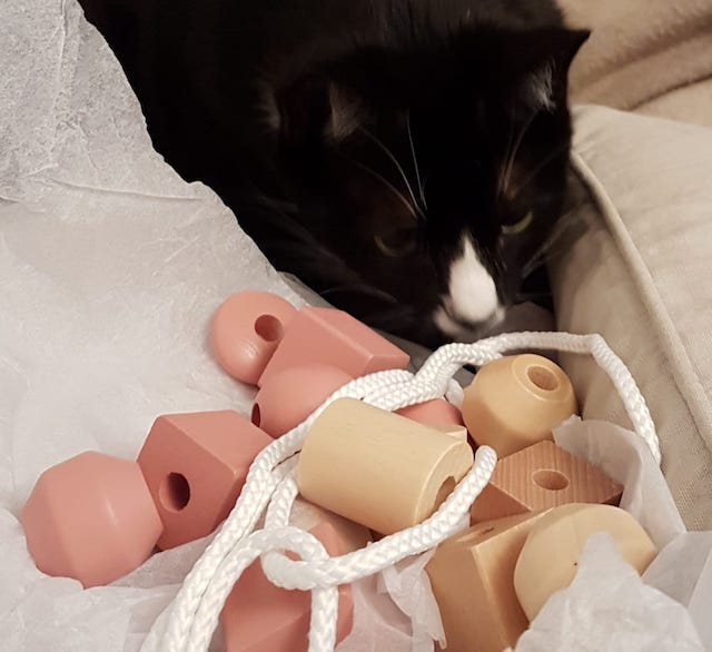Alors pendant que le chat de maison s’adonne à l’attaque de perles… je les lui soustrais l’une après l’autre pour une activation en simultané de mes doigts et de mes neurones !