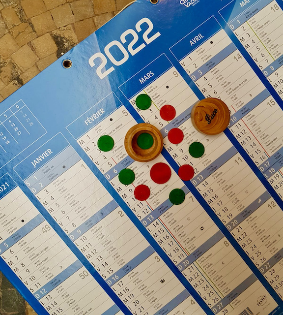 Bon, faut d’abord choper à la banque ou dans son entreprise un big calendrier en carton. Ce sera le plateau de jeu. Pour les pions on a le choix entre les délicieux pions de buis du jeu de puce du Si Tu Veux et le matériel qu’on a chez soi (une pièce de 2 euros = le lanceur et un bouton fin et sans rebord = la puce)