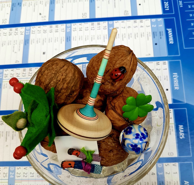 … noix surprise renfermant une pierre porte-bonheur, mini coccinelle en verre, minuscules poupées anti tracas, bille faite à la main …