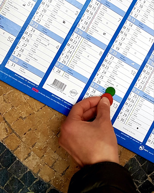 Bon, faut d’abord choper à la banque ou dans son entreprise un big calendrier en carton. Ce sera le plateau de jeu. Pour les pions on a le choix entre les délicieux pions de buis du jeu de puce du Si Tu Veux et le matériel qu’on a chez soi (une pièce de 2 euros = le lanceur et un bouton fin et sans rebord = la puce)