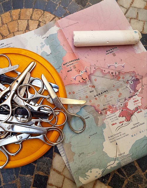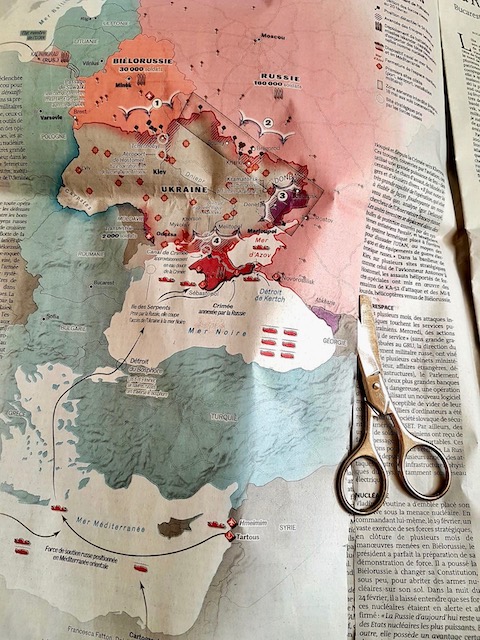 Pour situer l’Ukraine il faut user des ciseaux, découper, dessiner, adapter à l’échelle les cartes qui pullulent dans nos journaux, pour leur faire découvrir les distances nous séparant de ce pays dont ils entendent parler, ainsi que sa taille.
