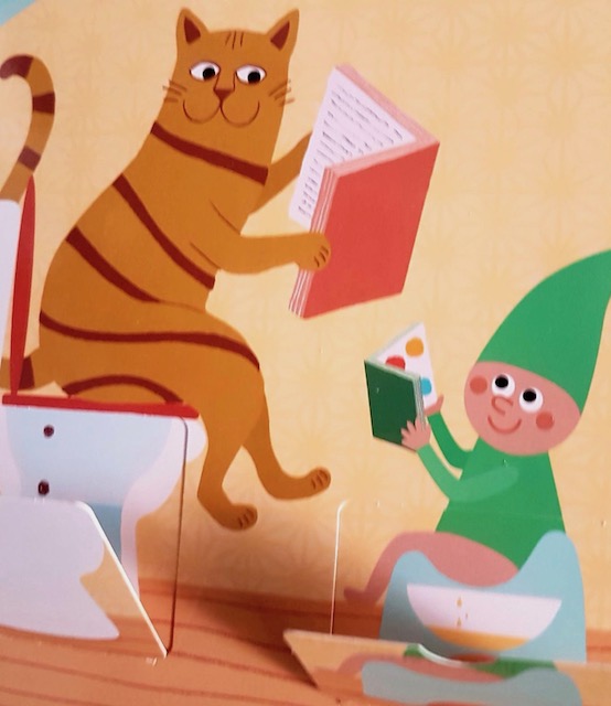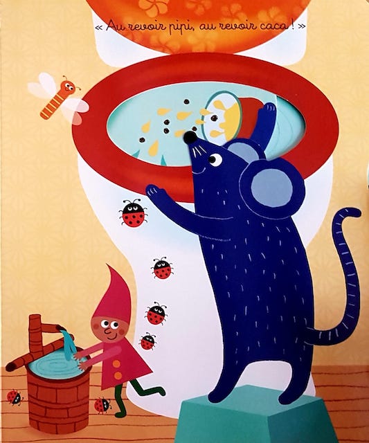 Tout est fait pour attiser leur curiosité et inciter le jeune lecteur à manipuler clapets, roue et tirettes afin de voir les personnages se débrouiller pour faire caca et pipi au bon endroit, et quand il faut. Il y a même de quoi actionner la chasse d’eau ! (Merci à Maryse Guittet, l’illustratrice qui a su si élégamment s’occuper de l’animation-tourbillon d’eau des toilettes, un pur délice !)