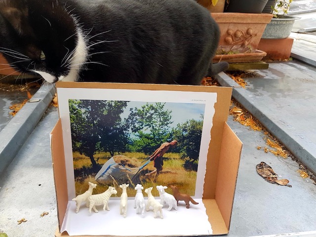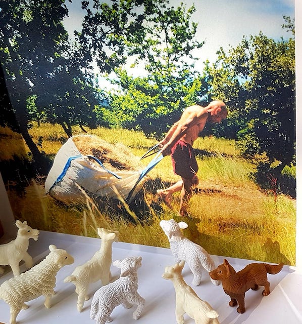 Mini animaux de ferme suivant du regard le labeur de celui qui, en plein champ, récolte leur foin pour l’hiver…