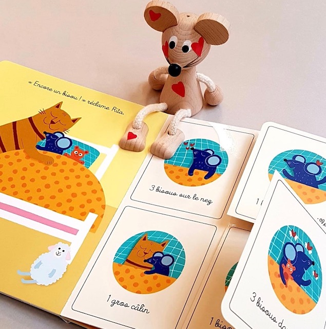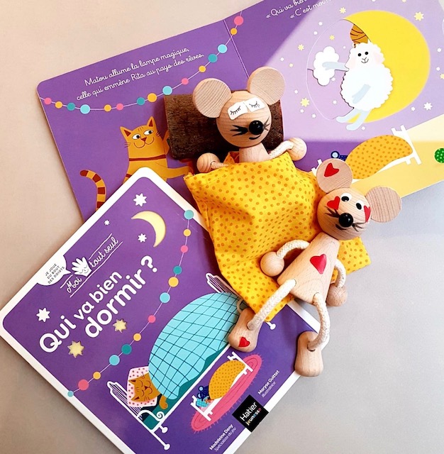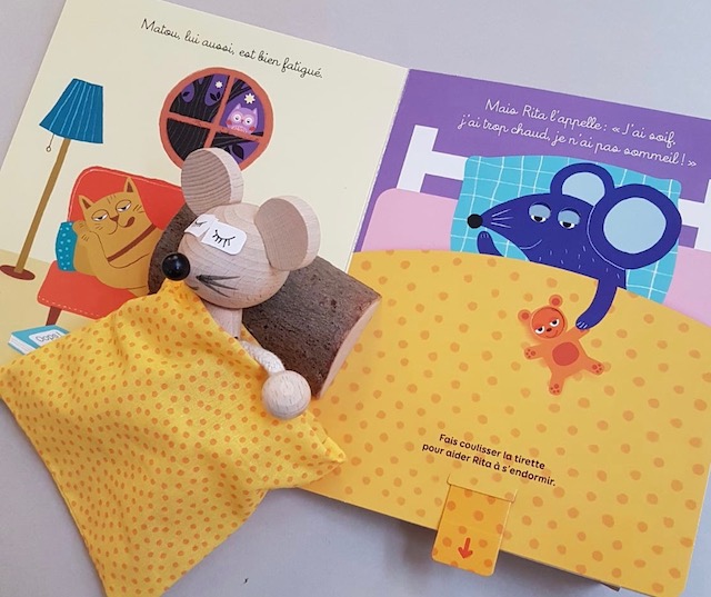 Tout complet, tout bien fait, avec ses tirettes et sa roue magique, on y découvre Matou le chat qui accompagne Rita la souris vers le sommeil, les préparatifs du coucher, l’histoire à lire, le jeu des cartes à bisous…Tendre petit moment et fameux rituel du soir qui clôt la soirée dans la douceur !