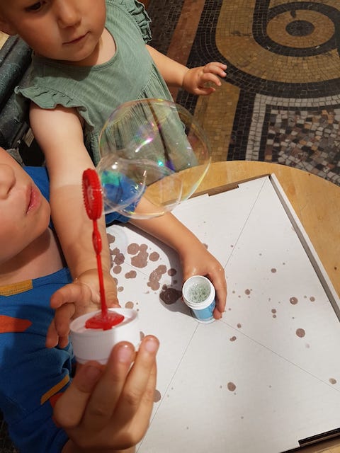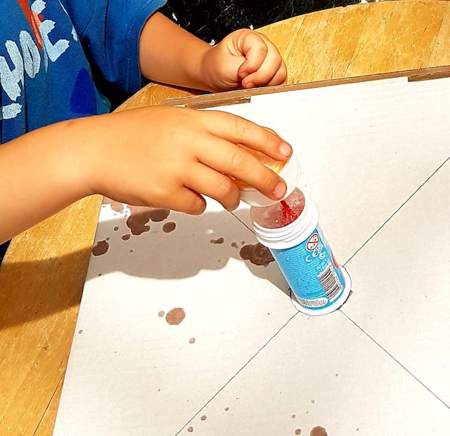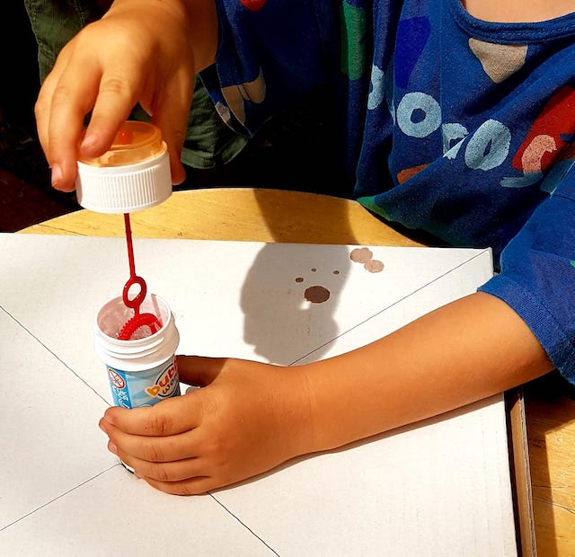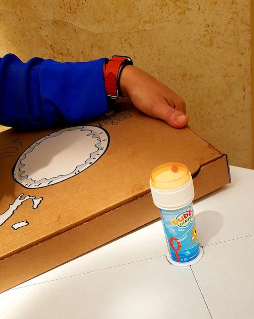 Ah, la bonne idée que j’ai eue pour éviter le fameux drame des tubes à bulles renversés… avec larmes jaillissant des yeux de nos petiots ! Suffit de récupérer une boîte à pizza, de la trouer (un trou un petit peu plus petit que le diamètre du tube à bulles) puis d’enfoncer l’engin à bulles dans son trou-logis de carton.