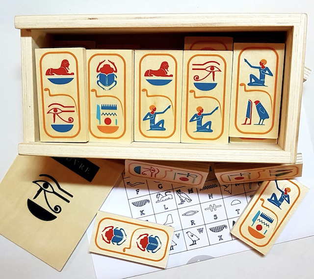 Pour ce beau jeu de bois j’ajoute un « Bon à savoir » bien clair sur la signification de l’écriture de l’Egypte Antique. Avouez que, sinon, c’est beaucoup moins intéressant de jouer avec ce domino des hiéroglyphes !