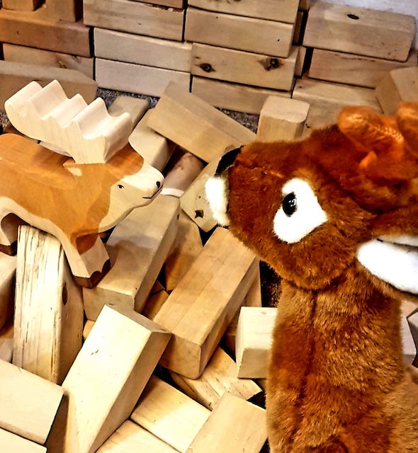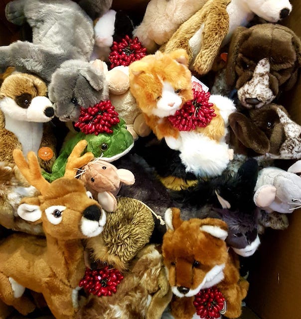 Ici les animaux en peluche sont considérés à l’égal des vrais, donc bien traités. Chiens, chats, hérissons, lapins, grenouilles, renards… je demande aux enfants de les caresser avec douceur, de ne jamais les laisser les « 4 fers en l’air » comme des peluches sans âme.