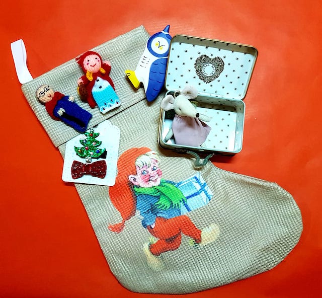 Et dans la chaussette koike que j’y mets ? Des marionnettes, une chouette, des barrettes …