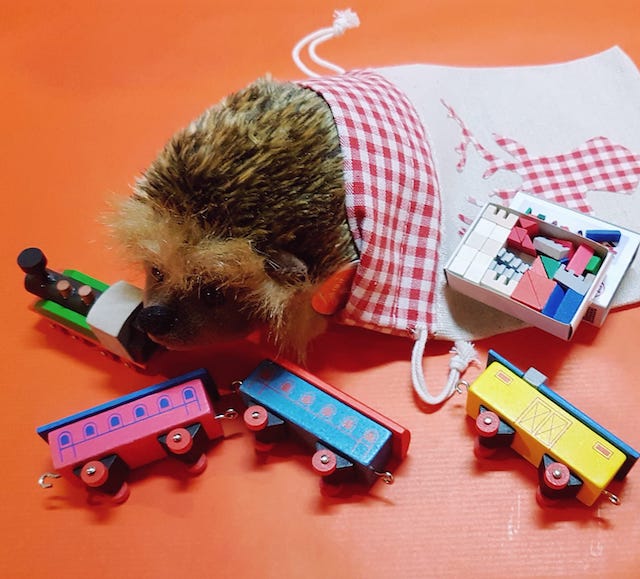 Je termine par le pochon avec locomotive et wagons, mini constructions et hérisson …