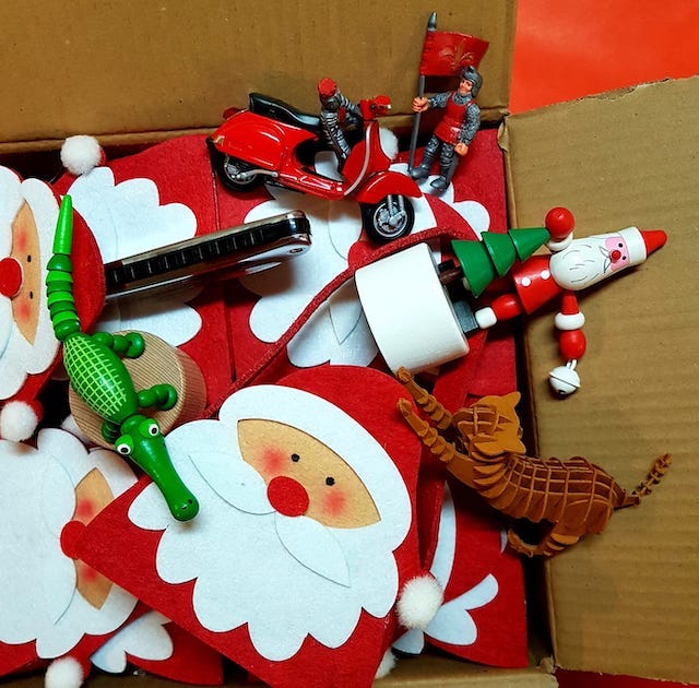Qu’ils sont jolis les cabas de Noël ! Et hop, j’en fais une amusette en farfouillant de partout dans le Si Tu Veux à la recherche de mini babioles pour les remplir z’avec noms se terminant par « A » : Koike que je mets dans mon cabas ? Des wakuvas et aussi une vespa, un harmonica, une maquette de chat, des soldats !