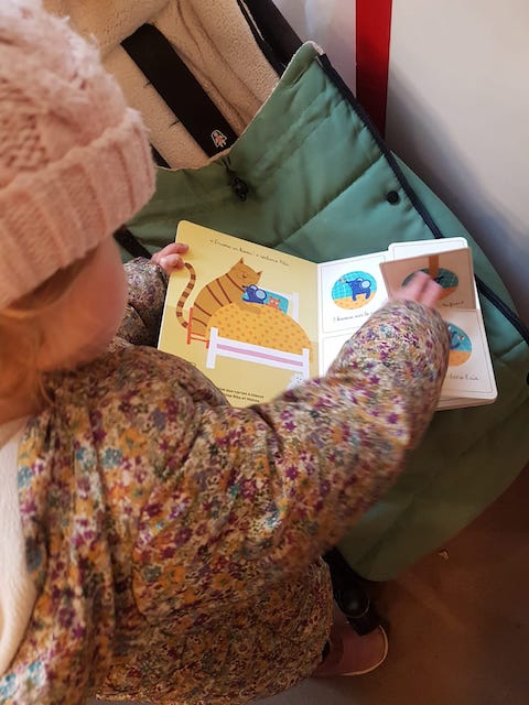 … puis se servir de sa poussette comme support pour le lire.