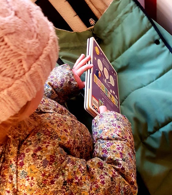 Je suis, de loin, son plaisir à soulever tous les flaps, à faire tourner la roue pour suivre toutes les étapes du sommeil réussi. Et hop, la mise en lien entre la lecture et la situation se met en place : « Allez bébé il faut dormir maintenant »