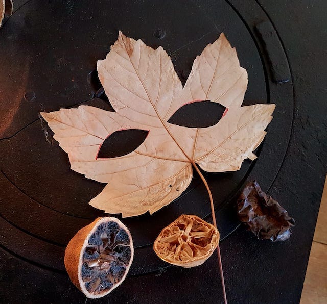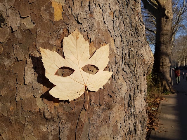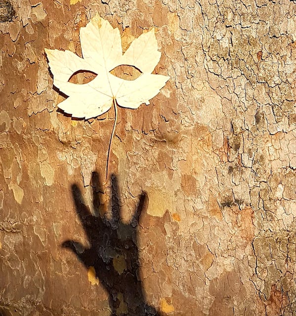 Puis aller à la rencontre d’un des arbres que je croise chaque jour et lui parler : « Salut gros platane, c’est Mardi Gras, faut te déguiser ! » Et hop je l’ai masqué !