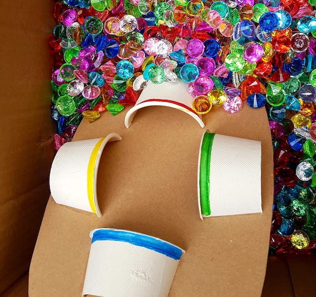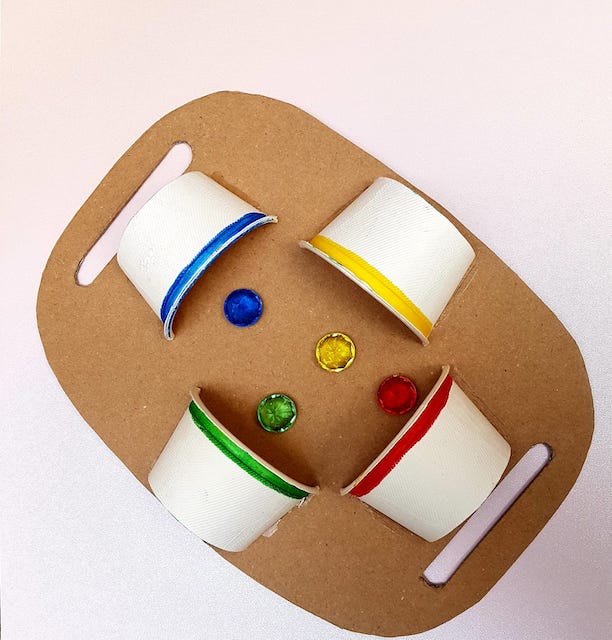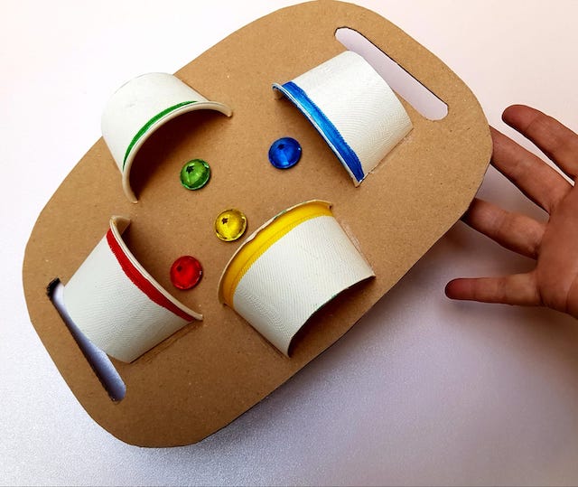 « Ce plateau de carton avec demi-gobelets collés sent l’activité Montessori à plein nez » a remarqué l’enseignante ! Elle a aussi apprécié ce matériel à 0 euro, utile à la reconnaissance des couleurs, et surtout à la concentration.