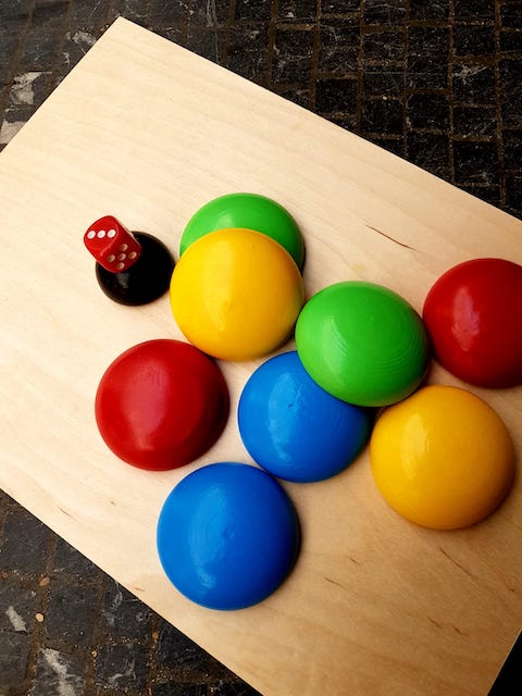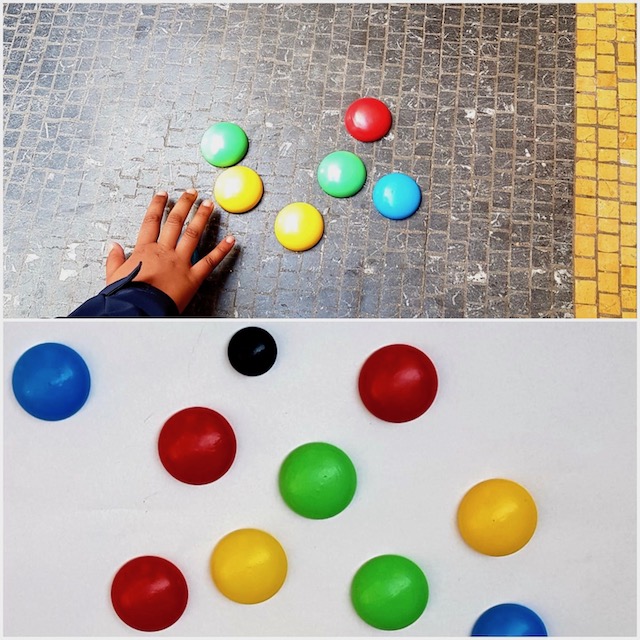 Les palets colorés peuvent bien sûr être remplacés par des couvercles de pots de confiture, mais pratiquer l’art-des-pois n’est alors pas possiblo !