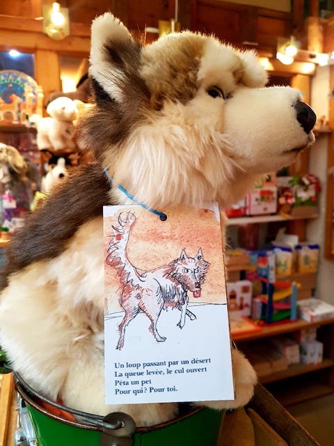 Un loup passant par le désert / La queue levée, le cul ouvert/ Péta un pet/ Pour qui ? pour toi.