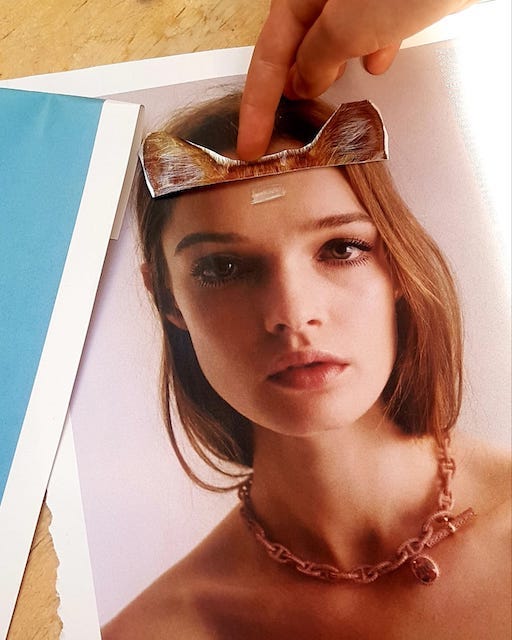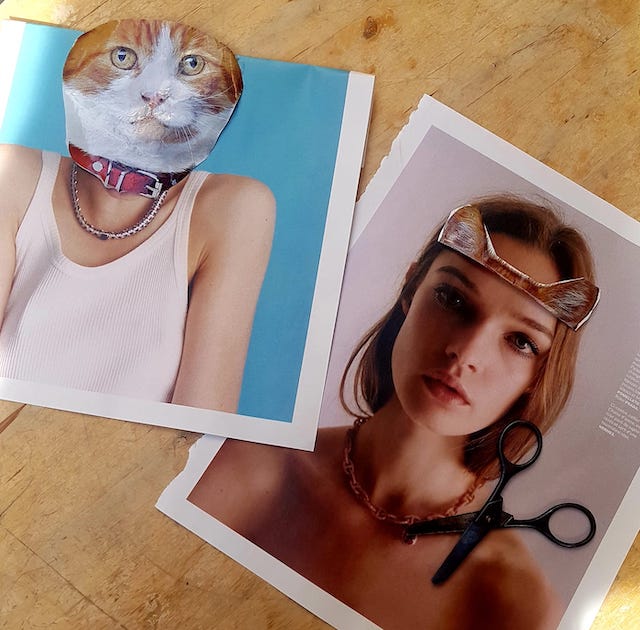 Pour ma part je n’ai pas résisté à montrer à une gussette comment faire un mix max, avec photos de magazine, sac de croquettes de chat vide et un bout de scotch pour coller tout ça.
