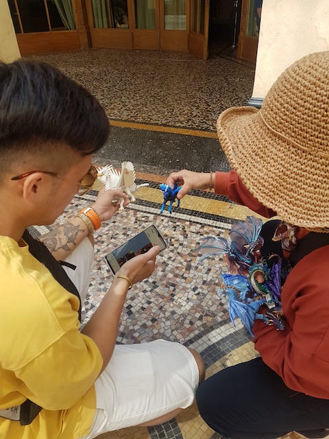 Il y a ensuite la demande « rien qu’un peu étonnante » d’une Mère-Grand taïwanaise et de son fiston. Il s’agit de sortir du magasin toutes les figurines de dragons pour en faire une vidéo avec belle lumière de la galerie Vivienne.
