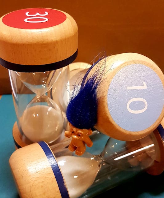 Celui de 10 minutes est bien pratique pour se mettre au défi de ranger sa chambre avant que le dernier grain n’ait rejoint la montagne de sable fin (Ouh, gagner contre le sablier c’est grave jouissif !)