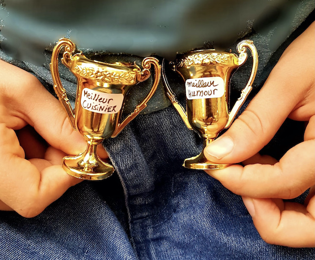 Sa petite sœur aura la coupe de championne des gros mots, son grand père celle de champion du jeu vidéo des minions, sa maman championne de vélo… sans s’oublier en se décernant la coupe du meilleur cuisinier de la maison … Et on décide de poser des étiquettes sur les coupes qu’il est impatient d’offrir !