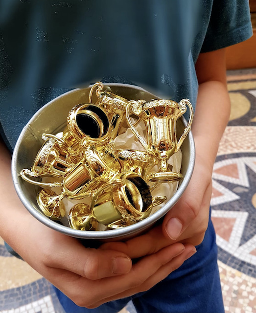 Vous z’ aussi lancez-vous dans l’activité-champions. Sans coupe d’or miniature, des pots de petits suisses recouverts de papier d’alu feront tout aussi bien l’affaire !