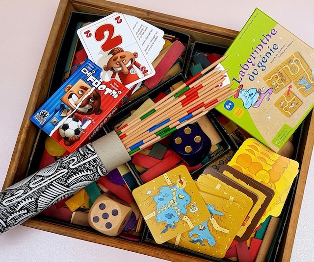 Et l’on fait ainsi : Chaque nom de jeu est inscrit sur un bâtonnet et l’on en tire un chaque jour, au hasard, à l’heure prévue pour une bonne partie de jeu en famille.