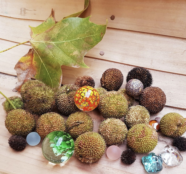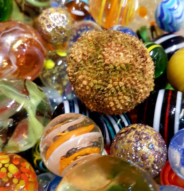 Ces boules, tombées d’un platane parisien, me font penser à ceux qui aiment tant les billes rares du Si Tu Veux.