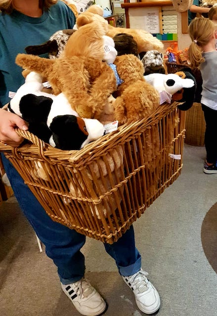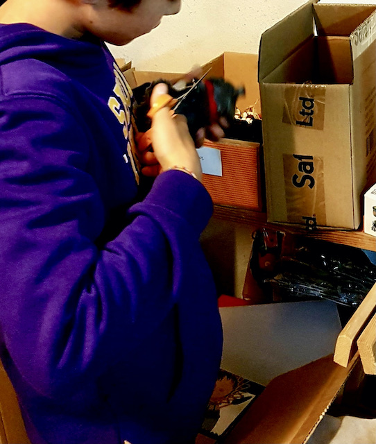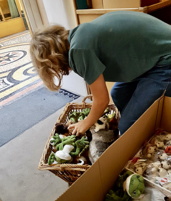 Grand moment pour ce 10 ans que de s’attaquer au grand carton bourré de doux animaux en peluche. Il en a plus d’une centaine à monter dans la réserve et à classer par catégorie (rongeurs, animaux des bois, chiens et chats, jungle et savane…)