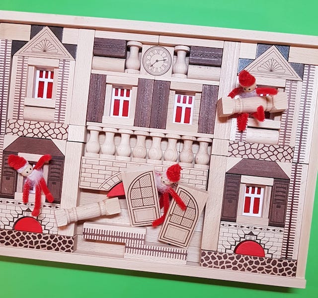 Heureusement je viens de recevoir la grande et magnifique boîte de construction en bois « Résidence » : 141 blocs de bois pour monter des murs, jouer à l’architecte avec des fenêtres, des balustres, des colonnes… Whaooou !